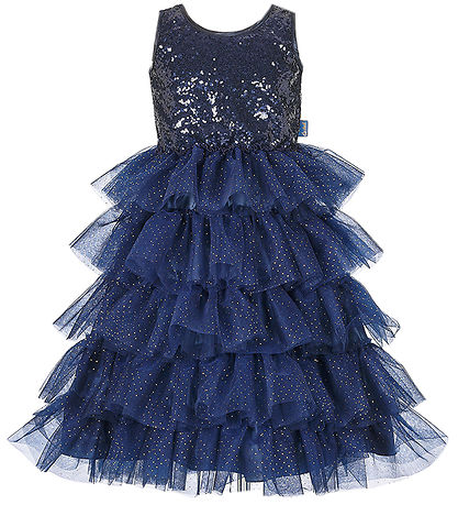 Souza -outfiten är i en fin, marinblått färg och dekorerad med paljetter och små guldprickar. Prinsessklänningen har en rund halsringning, inga ärmar, resårmudd runt midjan och en stor kjol med tyll och många lager.