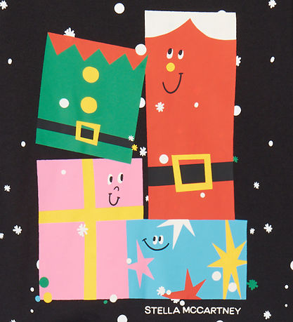Vacker Stella McCartney Kids sweatshirt i svart, och på framsidan finns ett färgglatt tryck med fyra rutor som ser ut som julklappar och tomtar. Överallt finns ett fint, vit tryck som ser ut som snöflingor.