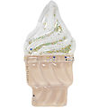 Cool SunnyLife luftmadrass med formen av en hamburgerfigur i blå, gröna och gula färger och med händer och ett leende ansikte.