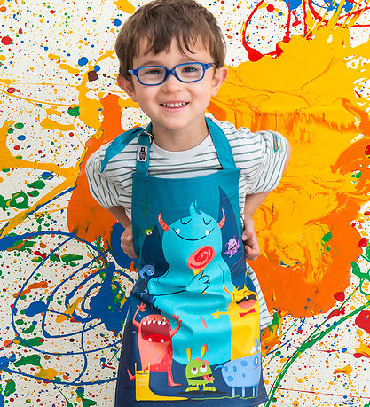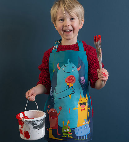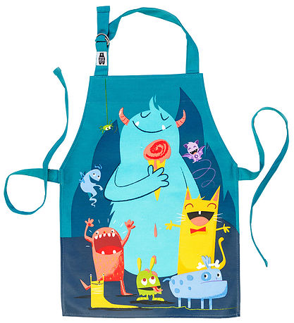 Fint ThreadBear- förkläde i mörk petroleumgrön med ett färgglatt tryck av coola, söta monster.