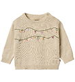 Smart Wheat tröja i dammgrön med tryck av bilar och arbetsmaskiner i blå, gröna och bruna nyanser. Tröjan har rund halsringning med smal ribbad kant och långa ärmar. Nederst finns en kort slits på båda sidor.