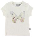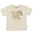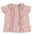 Charmig Wheat t-shirt i en mjuk rosa nyans med en fin ribbad struktur. T-shirten har korta ärmar och Ärm och kroppsöppningarna har vågiga kanter som ger en söt look.